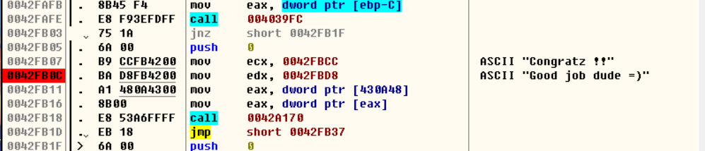 在0042FA5A处有跳转,由于应该要跳过Try Again和Sorry….,所以把这里修改为jmp
